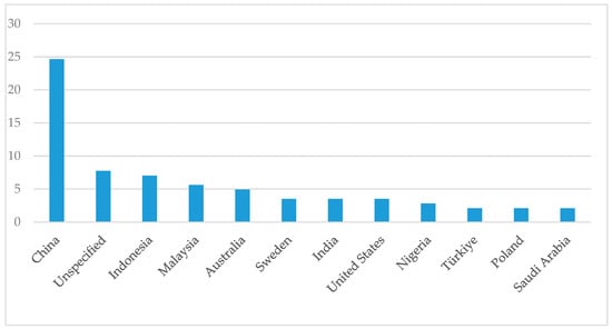 The research findings, as depicted in Figure 3, identify China as the leader in the number of studies related to the organizational climate in the construction sector. This Asian nation tops the list with a notable presence in the investigation of working conditions and the professional environment in the construction industry. Following closely, there is a category labeled “Unspecified”, which encompasses studies that do not specify the geographical location where the research was conducted. This group holds a considerable position in the ranking.