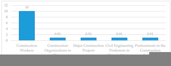 In this specific context, various trends in the obtained results were discerned. It is essential to note that, given the variability in the study topics, the composition of the population may differ considerably. For this reason, in this analysis, the choice is made to consider the most significant population among the retrieved studies, highlighting the importance of this comprehensive approach. In the exploration of the data, elements of the qualitative population were identified, adding an additional layer of complexity and richness to the understanding of the results. The population that stands out notably in this context is construction workers, followed by construction organizations in China, significant construction projects, and civil engineering and mining professors in China (see Figure 4).