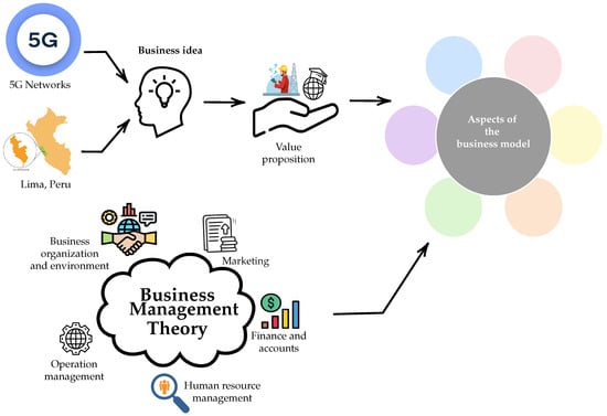 We describe the most important aspects of a business model based on a business idea (value proposition). A business model is proposed for a company that provides technical services to network operators to install 5G network equipment. The service provided is only oriented to a single network operator, so there is no competition between operators. The business model is based on observation, the over-deployment of the 5G network, and the absence of business models and companies oriented towards this technology in Peru; consequently, the business idea arises, and a value proposition is proposed. The value proposition is based on the experience (technical knowledge of 5G networks and business administration) and specialization (acquired outside their country of origin) of a team of professionals proposed so that the company, through them, offers the service to network operators and carries out the administration in the different departments of the company. Therefore, the business model and the business structure (company) design start with the value proposition, specialization, and expertise (Liu et al. 2021). On the other hand, for the design of the business structure, we have employed the concepts of business management (Lominé et al. 2019), which encompasses business organization and environment, marketing, finance and accounts, human resources management, and operational management. For this reason, the business design encompasses different aspects of the proposed business model, as shown in Figure 1.