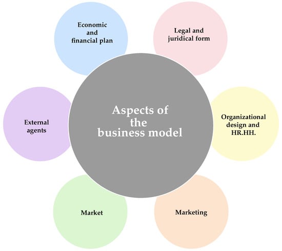 These aspects are the following: the external agents, market, marketing, organizational and HR.HH, legal and juridical plan, and economic and financial plan. In Figure 2, each of these aspects is seen in detail.