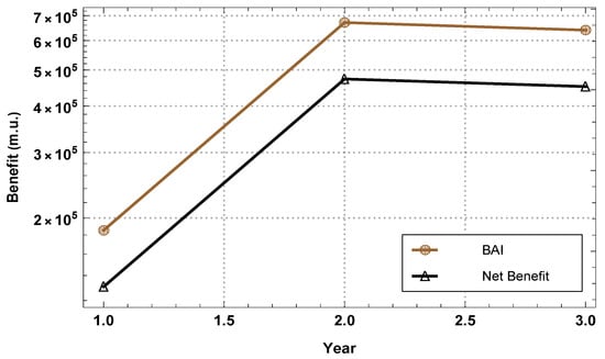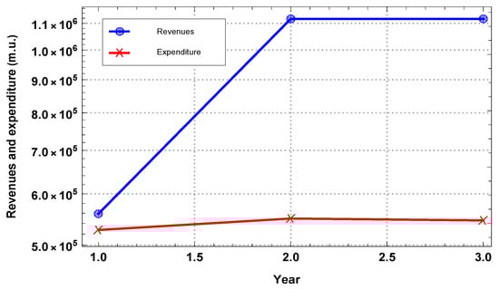 Figure 7 shows the revenues and expenditures projections as a time function. We can observe that the revenues increases as time increases; specifically, it increases by 50% in years 2 and 3 concerning year 1. While the expenditures experience a slight growth as time increases, the costs remain below the revenues; therefore, this result shows that a more significant profit is obtained from the company’s activity.