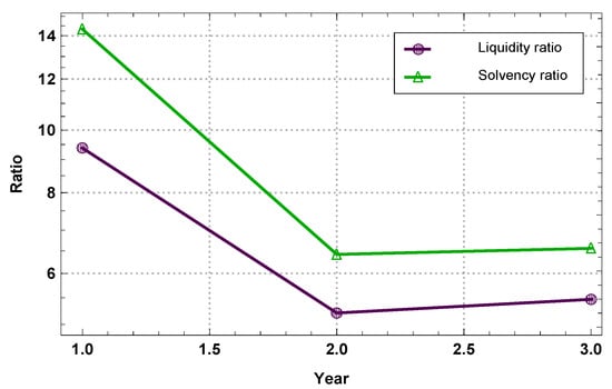 Figure 9 shows the behavior of the liquidity and solvency ratios in the first three years of the company’s activity. We can observe that the liquidity ratio decreases from year 1 to year 2. The company would incur excess liquidity as its current assets are more than nine times its current liabilities (see Table A4 and Table A5, Appendix B). It would be losing profitability in its current assets, so it would be required to analyze its existing assets to seek greater profitability. Likewise, we can observe that the solvency ratio follows a similar behavior to the liquidity ratio; however, as the solvency ratio is greater than 1, the company can meet its payment obligations at a given moment.