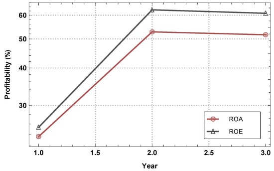 Figure 10 shows the behavior of the profitability of assets (ROA) and profitability of equity (ROE) in the first three years of the company’s activity. We can observe that ROA increases in the first three years and is positive; this result makes sense since there is an increase in sales, and, therefore, the company can generate revenues from assets. Likewise, in the same way as ROA, ROE increases and is positive. This result shows that the capital invested by the partners generates positive net profits. These ratios lead us to the conclusion that the business model is profitable.