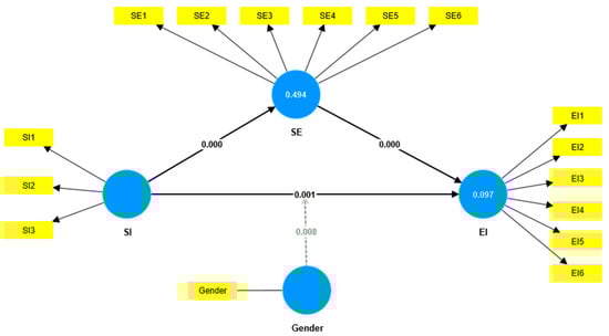 Based on Kock’s (2015) criterion that recommends VIF scores below 3.3, we observed that the minimum value was 1.208 (SE6) and the maximum value was 2.833 (EI4), values below the threshold of 3.3. In conclusion, this study’s common bias is not meaningful (see Appendix A).