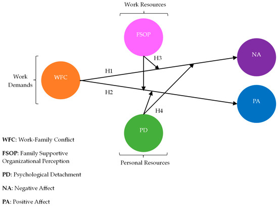 In this work, we bring together the JDR model and PA and NA constructs to delve into the psychological mechanisms inherent to the health-impairment process of the JD-R model and thus understand how individuals navigate and manage their emotional experiences amidst work–family conflict. See conceptual model depicted in Figure 1.
