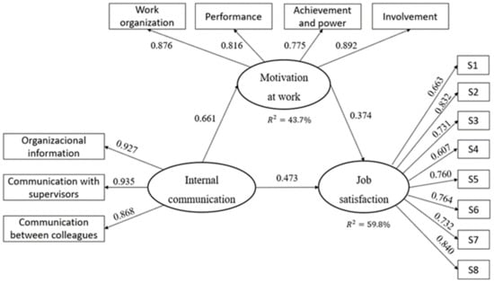 After obtaining the scores of the first-order latent variables, the two second-order latent variables were modelled as if they were a first-order latent variable, where the scores of the internal communication and work motivation dimensions play the role of the observed variables (Figure 2). In this model, according to Figure 2, it can be seen that the items whose loadings are less than 0.708 refer to the job satisfaction construct (items S1 and S4). These items were not removed from the model because they refer to various aspects linked to job satisfaction that are important for defining the job motivation construct and also because indicators with external loadings between 0.40 and 0.70 should only be eliminated if they result in an increase in reliability and AVE above the values considered adequate (Hair et al. 2022). The reliability of the constructs is considered adequate because the values of the Cronbach’s alphas and composite reliabilities are above 0.7 (Hair et al. 2019). The convergent validity is also considered adequate as the AVE values are above 0.5 (Hair et al. 2022). The internal communication variable explains 43.7% of the work motivation variable, and these two variables together explain 59.8% of the variation in the job satisfaction variable. These values in the field of social and behavioural sciences are considered large effects (Cohen 1988).