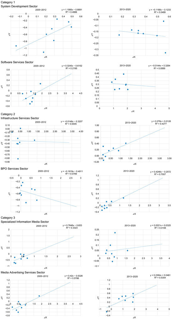 The six digital sectors are classified into three patterns, as shown in Table 3. As shown in Figure 3, our results indicate that some sectors are inconsistent with the results of Assessment 1. When comparing the value transfer percentages presented in Table 2 with the coefficients of X from 2013 to 2020 in Table 3, only the BPO services and specialized information media sectors are found to be inconsistent. For the remaining four sectors, the trends in the value transfer rate are consistent with the rate of return on labor investment.