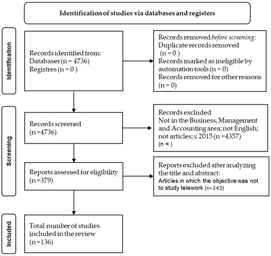 The validity of a study pivots on the appropriate selection of a database, as it must adequately cover the area under investigation. Scopus is currently the largest multidisciplinary database in existence and at the time of this writing indexes 26,591 peer-reviewed journals with more than 97 million documents (Elsevier 2023). It is considered one of the most important bibliographic databases (Cobo et al. 2011), and for this reason was chosen to apply in the study. The selection took place on 20 June 2023 using the keywords “Telework”, “Telecommuting”, and “Teleworking”. The choice of these keywords was based on an attempt to gather as many relevant articles as possible because different authors use different designations for teleworking. This first search returned 4736 documents. It was then necessary to establish inclusion criteria to limit the scope of the investigation to the field of articles written in English, between 2016 and 2023, and in “Business, Management, and Accounting” (Table 3). The second search identified 379 articles. We then inspected the titles and abstracts of the 379 articles to identify those that address our research goals, in other words, to exclude “false positives”, i.e., articles that mention the keywords but refer to different subjects. No study should be excluded because it is deemed to be of low quality or to contain methodological or other flaws, as this could bias the review (Linnenluecke et al. 2020). This step led to the exclusion of 243 articles that were outside the scope of the study or did not develop the concept of teleworking, leaving a total of 136 articles to be included in our SLR. Our selection of articles followed the guidelines of the PRISMA 2020 (Preferred Reporting Items for Systematic Reviews and Meta-Analyses) research strategy, which is an update of the 2009 guideline. These guidelines have been widely adopted by authors cited in over 60,000 articles in the Scopus database (August 2020; Page et al. 2021). The PRISMA flow diagram Figure 1 illustrates the steps used to eliminate articles not relevant to the study.