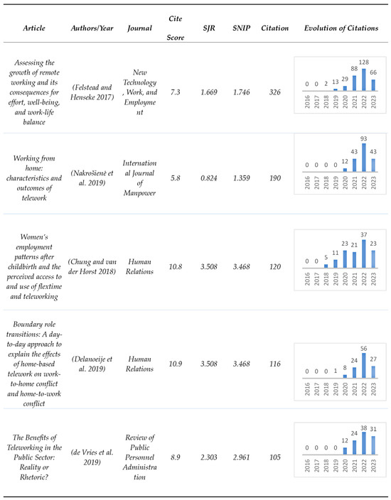Figure 4 reports the five most-cited articles (those that were cited at least 100 times). These account for 28.3% of the total number of citations. The table is structured in such a way as to show the name of the article and respective authors, the journal in which it is published, as well as its metric indicators, and the evolution of citations over the years, in descending order to the number of citations. Of the articles published between 2017 and 2019, the most cited is “Assessing the growth of remote working and its consequences for effort, well-being and work-life balance” with 326 citations. The authors A. Felstead and G. Henseke, as mentioned above, are the authors with the highest number of citations, resulting from the publication of this article. Also, the authors A. Nakrošienė, I. Bučiūnienė, and B. Goštautaitė, with just one article, are among the most-cited authors with their publication “Working from home: characteristics and outcomes of telework”, in the second most cited, even the journal in which it appears (International Journal of Manpower) does not have the best classifications in the indicators but is the journal that contributed most to the topic. It is worth noting that although T.D. Golden is the second most-cited author, none of his works are found in this table. The journal Human Relations contains two of the most-cited articles in this sample and is the journal with the best classification of those in Figure 4. The article “The Benefits of Teleworking in the Public Sector: Reality or Rhetoric?” is also in the ranking of the most-cited publications. Note, too, that all articles saw an increase in their citations from 2020 on, peaking in 2022. This once again points to the growing interest in this subject upon the emergence of the pandemic.