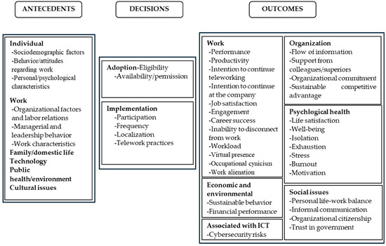 Antecedents refer to the reasons for engaging or not in a certain behavior and, therefore, can have a direct influence on decisions or an indirect influence on results (Paul and Benito 2018). Antecedents directly explain why a decision is made or not, and indirectly why a result has value or not (Lim and Rasul 2022). In this review, the authors report about six main categories of antecedents of teleworking cited in articles: individual, work, family/domestic life, technology, public health/environment, and social aspects.