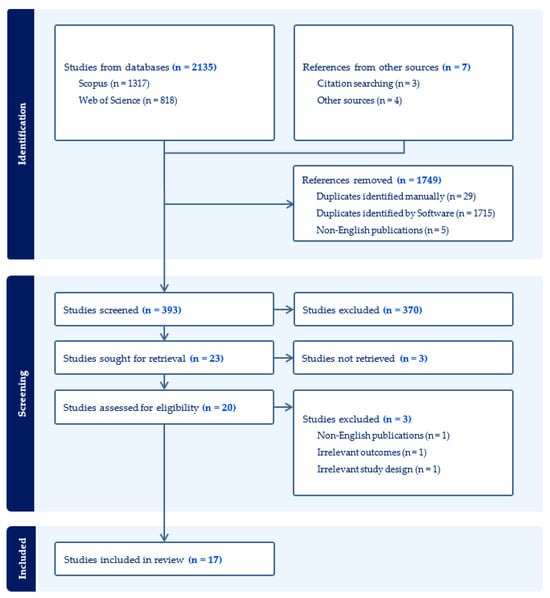 The initial search yielded 2142 articles. Following the removal of 1749 duplicates, the titles and abstracts of 393 articles were screened for relevance to the research question. Articles that did not pertain to the G-HRM practices or policies were excluded during this phase. The full texts of 20 articles were then assessed for eligibility based on predetermined inclusion and exclusion criteria. Finally, 17 articles were determined eligible for this review and were further analyzed. Figure 1 presents the different steps of article screening and exclusion criteria.