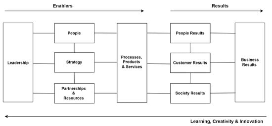 - Suárez, Eva, Arturo Calvo-Mora, José L. Roldán, and Rafael Periáñez-Cristóbal. 2017. Quantitative research on the EFQM excellence model: A systematic literature review (1991–2015). European Research on Management and Business Economics 23: 147–56. [Google Scholar] [CrossRef]