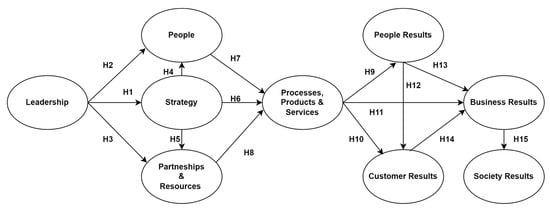 Considering the above, the scholars’ recommendation to more deeply explore the EFQM model with a focus on public sector organizations, as well as the fact that the EFQM Model 2013 is a well-established framework extensively referenced in the existing academic literature, the authors chose the EFQM Model 2013 for this research. This choice was based on its solid theoretical foundation, which provides a more substantial basis for analysis and the expectation that its use ensures methodological continuity. This allows for the direct comparison of the findings with those of the existing literature. By focusing on the EFQM Model 2013, this paper contributes to the academic and practical understanding of its applicability, reliability, and validity in the context of the Greek public administrative services. Furthermore, this focus will enrich the literature with specific insights into the EFQM Model 2013 effectiveness and the details of its implementation in the public sector. Specifically, this study examined the relationships between the constructs leadership (L); strategy (S); people (P); partnerships and resources (PRE); processes, products, and services (PRO); people results (PR); customer results (CR); business results (BR); and society results (SR). Therefore, the hypotheses of this study are as follows: