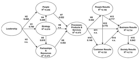The results indicate that the proposed research model was reliable and valid for the context of this study. In addition, this study’s results provide evidence for the confirmation of the vast majority of the hypotheses regarding the cause–effect relationships between the enablers and results criteria of the EFQM Model 2013. Specifically, 12 of the 15 hypotheses were confirmed at high levels of significance (H1, H2, H4, H5, H7, H8, H9, H10, H11, H12, H13, H15). Moreover, the results showed that leadership had positive effects on strategy (0.760) and people (0.468), which are supported by previous literature (Belvedere et al. 2018; Đorđević et al. 2021; Kaplani 2023; Para-González et al. 2021; Zhang et al. 2021). These findings underscore the critical role that leadership plays in formulating policies and motivating people; therefore, public sector services need to pay great attention to the leadership cultivated in their organizations and provide guidance on how it can be effective.