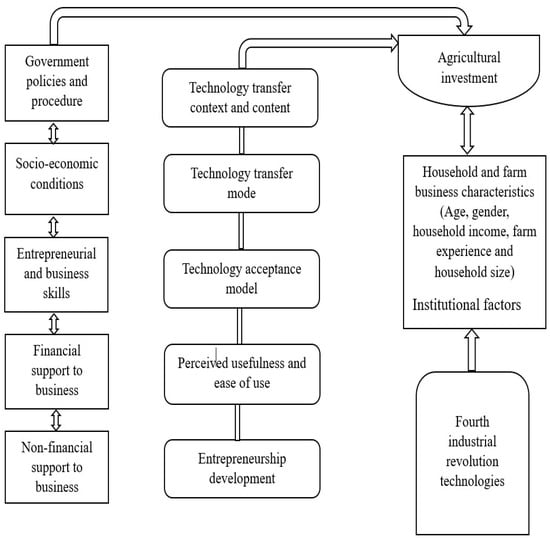 The transfer of technology to promote entrepreneurship identifies technological content and context, technology transfer mode, and the economic level of a country as important attributes for entrepreneurship development (Lado and Vozikis 1996). As the fourth industrial revolution is driven by advanced technological innovations, Davies et al. (1989) asserted that the technology acceptance model becomes central to measuring whether an individual accepts technology not based on perceived usefulness and perceived ease of use. Lastly, to conceptualize the investment aspect of the topic, the Kalecki model of investment in agricultural business. According to Grzelak and Kułyk (2020), the Kalecki model of investment in agricultural business views investment as a binary concept that is based on demand and supply. In the context of the present study, this means that to enable agricultural investment in the fourth industrial revolution for small farm business entrepreneurs to thrive, government policies, education and training, financial and non-financial support, socio-economic conditions, perceived usefulness and ease of use, financial support and entrepreneurship development are of prime importance in this regard.