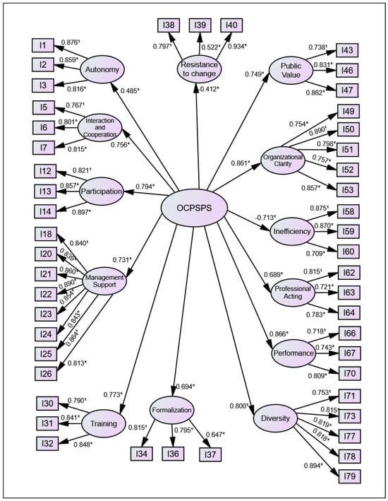 For the dimension of interaction and cooperation, it was necessary to remove items 10 (0.558), 11 (0.608), 8 (0.618), and 9 (0.625). As for management support, correlations between the errors of items 25 and 26 (0.188), 20 and 24 (0.153), 18 and 21 (0.175) were found, and item 19 (0.731) was removed. Regarding training, items 27 (0.443), 28 (0.657), and 29 (0.622) were removed. For resistance to change, items 38, 39, and 40 were retained, and item 41 (0.395) was excluded. For public value, items 48 (0.538), 42 (0.678), 45 (0.631), and 44 (0.676) were removed. Regarding organizational clarity, the following correlations between the errors of items 51 and 52 (0.512), 49 and 52 (0.377), 49 and 51 (0.196) were found. For inefficiency, items 57 (0.519), 54 (0.548), 56 (0.660), and 61 (0.647) were removed. In terms of performance, items 68 (0.641) and 69 (0.648) were excluded. For diversity, items 74 (0.570), 75 (0.633), 76 (0.614), and 80 (0.643) were removed.