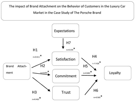 Regarding the correlation between the variables commitment and brand loyalty, this association recorded an rs = 0.683 and p ≤ 0.01, i.e., a strong correlation. These are positively connected and related. Thus, respondents who are more committed to the Porsche brand also tend to show high levels of brand loyalty. In addition to this, and taking into account the fact that the correlation is statistically significant, Hypothesis 5 (H5) of this research is confirmed: