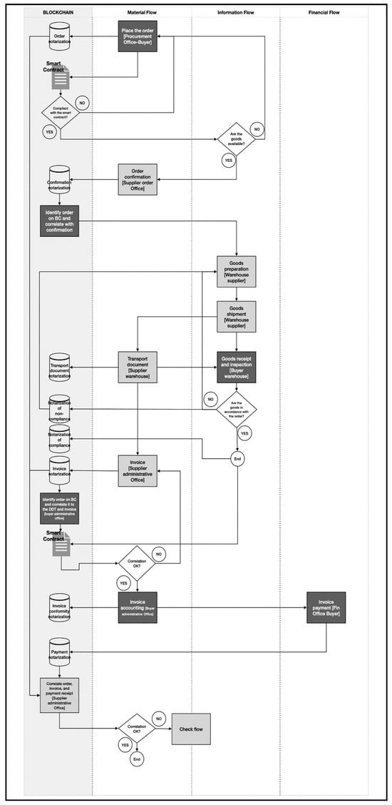 - Verification activities, as outlined in point 2 of the current process, involve checking the conditions stated in the order against the supply agreements. The subsequent activation of the informational flow (with order confirmation) and the material flow (order preparation) depend on this verification. The proposed re-engineering involves the use of blockchain technologies for automating this step, using smart contracts to ensure that the involved parties verify the supply conditions. This optimizes resources by freeing up human resources from manual verification tasks, eliminates the risk of errors that may occur during verification, and streamlines the execution times of supply-related flows.