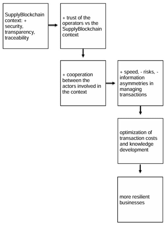 - Linked to the favorable and transparent atmosphere of the context within which supply chain exchanges take place, resulting from the implementation of blockchain technologies. As described in the managerial implications section, this configuration can be considered the new paradigm of the concept of “trust”, namely trust placed in the expression of security, transparency, traceability, and efficiency that blockchain technologies may be able to guarantee for supply chains.