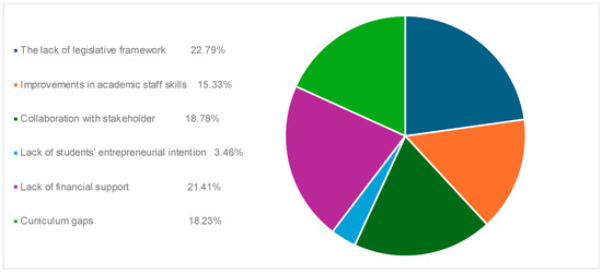Regarding the qualitative analysis of the text versions of the interviews and questionnaire responses, different barriers and opportunities were identified, as described below. Figure 1 presents a pie chart showing the barriers identified from the interview and questionnaire results. The main barriers perceived by experts, teachers, and students are the lack of governmental support, both in the legislative framework and in funding, collaboration with different stakeholders, including the private sector in terms of entrepreneurship, curricula not being fully aligned with sustainable/entrepreneurial concepts, and the improvement needed in academic staff skills; while a barrier that was perceived as being of low importance is the lack of students’ entrepreneurial intention. Figure 1 shows the percentages of experts and respondents who perceived each barrier as the most important: the leading barrier is the lack of a legislative framework (22.79%), followed by the lack of governmental funding (21.41%), resulting in the conclusion that the lack of governmental support is perceived as the main barrier by the majority of participants in this study. The next most important barriers are perceived to be collaboration with stakeholders (18.78%) and curricula not being fully aligned with these concepts (18.23%). Also, the improvement in academic staff skills is another important barrier (15.33%), while the lack of students’ entrepreneurial intentions is perceived as important by 3.46% of the respondents.