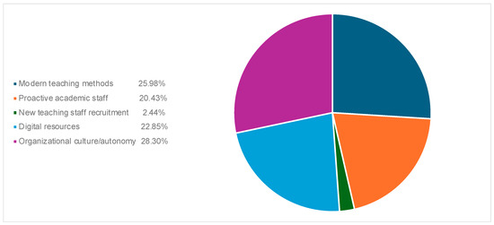 Moreover, during this study, the main opportunities were highlighted in the responses of the participants, including the modern teaching methods used by universities, digital resources, organizational culture, internal autonomy, and proactive academic staff. An opportunity that was perceived as important by only 2.44% of the participants is the new recruitment of academic staff who have a modern approach to entrepreneurship and sustainability. In detail, as shown in Figure 2, the most important opportunity perceived by the majority of participants is the organizational culture and internal autonomy of universities (28.3%), followed by the use of modern teaching methods rather than the traditional ones (25.98%), the use of digital resources (22.85), and proactive academic staff. A less well perceived opportunity is the recruitment of new academic staff.