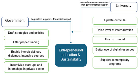 Firstly, a meaningful method of entrepreneurial education with a positive impact on sustainability is support for incubators and accelerators. In this context, a practical approach from universities can equip students with proper skills in various dimensions. Furthermore, interdisciplinary learning contributes positively to both entrepreneurial education and sustainability. During recent years, these universities have been focused on modern teaching methods rather than traditional ones, with updated curricula, numerous projects on entrepreneurship, different partnerships with private sector companies, and event projects for start-ups. In particular, the collaboration of universities with private sector companies is a good opportunity that should be used by students for further steps towards entrepreneurship. It is perceived that these universities have the ability to offer various products regarding entrepreneurship, but they lack a sustainable approach in their curricula.