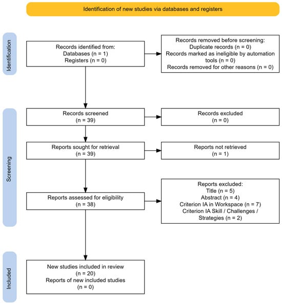 We excluded one article due to lack of access. The remaining 38 documents were screened by a solo researcher, analyzing titles—excluding five documents—and abstracts—excluding four documents. The remaining articles were analyzed for eligibility and focused on their alignment with the research questions. We excluded 9 papers for not answering the research questions: 7 failed to discuss AI in the workplace, and another 2, although included in the discussion of AI in the workplace, failed to present discussions about skills, challenges, or strategies for AI adoption. At the end of the analysis, 20 papers were selected.