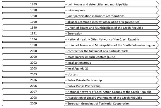 In 1990, there was a “re-establishment” of territorial self-government and other legislative changes that strengthened the powers of municipalities and allowed them to develop other forms of cooperation, such as micro-regions, joint participation in business corporations, and interest groups of legal entities (associations). The activity of the Union of Towns and Municipalities of the Czech Republic was restored. The whole period of the 1990s involved the emergence of new regional and national cooperation structures, and further acceleration occurred in connection with the accession of the Czech Republic to the European Union in 2004. The end of the first decade of the twenty-first century was connected to the strengthening of relations between the private and the public sector and with the splitting of existing forms of cooperation, so that regional development actors now face a fragmented structure with more than twenty possible ways of cooperation (for more details, see Figure 1). In individual areas, however, this cooperation has different intensities and spatial arrangements, as can be demonstrated by the example of cross-border cooperation in the Czech Republic, which has been developing very slowly—the relationships between partner towns and municipalities were restored in 1989; the Euroregion was formed right after that in 1991. Other forms are already inherently tied to the accession of the Czech Republic to the European Union (from 2000 the cross-border impulse centers, and from 2009 the European Groupings for Territorial Cooperation). With the exception of Prague and the Central Bohemian Region, all regions (NUTS 2 level) in the Czech Republic are involved in cross-border cooperation.