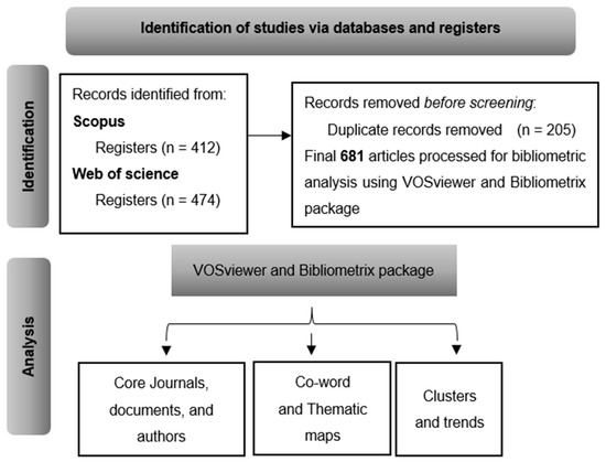 Considering the PRISMA reporting guidelines, which are designed to help researchers transparently report methods and findings, this study performs a scientometric and bibliometric analysis, which is carried out using two prominent databases, Scopus and WoS, which were gathered over 20 years from 2003 to March 2024. Merging these two databases provided an understanding of the progress and the trends in the study area. WoS is a broad repository of distinguished journals known for its strong significance factor. Institutions, universities, and organizations are extensively used to access and appraise superior studies with citations and impact factors. It is a suitable and reputable database well fitted for bibliometric and scientometric analyses. Scopus is the most extensive research database, with immense coverage across multiple disciplines. Both offer the option to export data in BibTex format, which smooths the use of bibliographic packages for further analysis. Likewise, this study used Google Scholar to obtain the total global citation indicator (TGC).