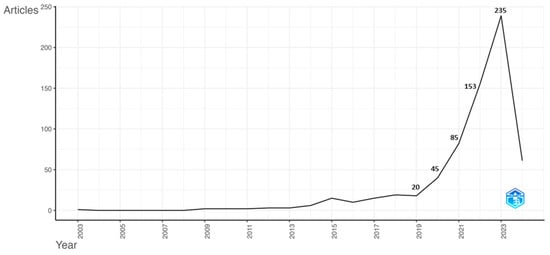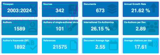 The Scopus and WoS databases contained 412 and 474 research studies, respectively. After identifying and eliminating the duplicate records, 673 unique research studies were made available from both sources, as shown in Figure 1. The documents cited a total of 21,575 references. The publication period is from 2003 to March 2024. The analysis of the publication outputs showed an unsteady growth pattern, with an average annual growth rate of 21.62%, 1589 researchers, and 1892 author’s keywords, as shown in Figure 2.