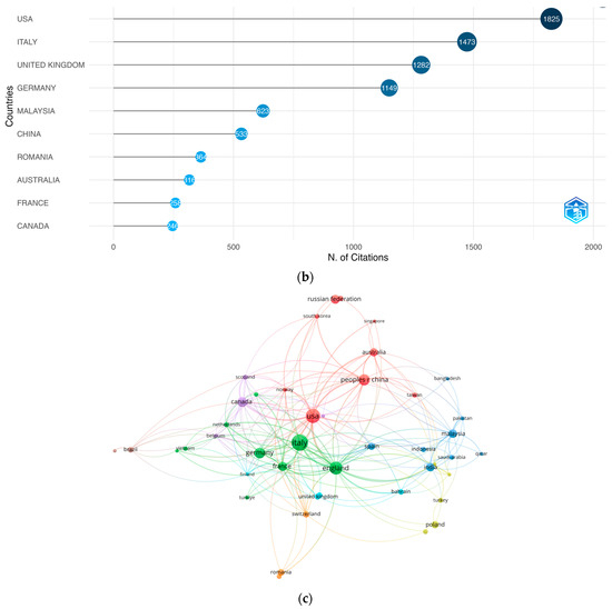 Authors’ country analysis: (a) corresponding authors’ countries, (b) most cited countries, and (c) cooperation networks among countries. Source: authors’ own research using Bibliometrix and VOSviewer tools, as well as Scopus and WoS databases.