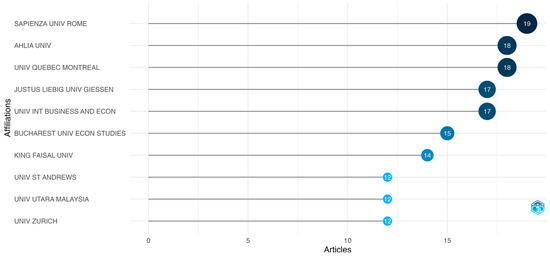 In the time lapse between 2003 and 2024, 342 institutions have been involved in the banking industry and ESG field. Positioned based on their registered publications, the ones that stand out most are displayed in Figure 5. Sapienza Università di Roma has 19 studies, Ahlia University has 18 studies, and Université du Québec à Montreal has 18 publications, disputing the lead with just one study being the difference between them. Behind the top three places are Justus Liebig University Giessen and the University of International Business and Economics with 17 studies each, as RQ 4 established.