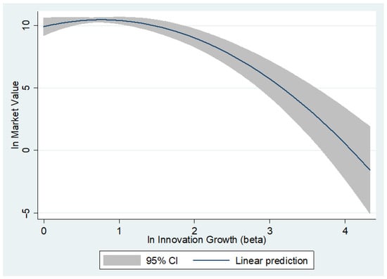 We start with a baseline model with controls. Model 1 tests Hypothesis 1 claiming that innovation growth has an inverse U-shape effect on firms’ market value. The first-degree coefficient is significant and positive (β = 1.267, p < 0.01) and the second-degree coefficient is significant and negative (β = −0.730, p < 0.001). To claim support for this hypothesis, we go beyond regression results and test the inverted U-shape with the Stata U-test (Lind and Mehlum 2010). The test in Table 3 reveals that slope is sufficiently steep at both ends of the range and that the turning point confidence interval is located inside the min–max range of the predictor variable. Table 4 reports the average marginal returns for the entire min–max interval of the predictor showing that the slopes remain significant between ±1 s.d. of the predictor. Figure 1 corroborates the results. We conclude that Hypothesis 1 is supported.