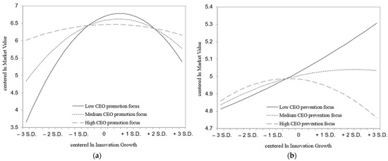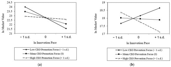 Hypotheses 4a–b investigate the effect of having a promotion (prevention)-focused CEO on the innovation pace–market value relationship. In Table 7, Model 6 tests the moderating effect of CEO promotion focus and reveals that the promotion regulation mechanism mitigates the negative effect of high pace on market performance. The coefficient is positive and significant (β = 0.002, p < 0.001) and the moderating effect holds for the entire ±1 s.d. The graphical representation shows that as CEO promotion focus increases, the negative effect is attenuated (Figure 3a). We conclude that Hypothesis 4a is supported.