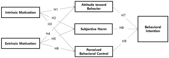 These intrinsic and extrinsic motivational factors have been linked and studied as influences that explain behavioral intention in the TPB. The Theory of Reasoned Action (TRA) (Ajzen and Fishbein 1980), which explains how an individual’s attitudes and the expectations of those around them influence their behavioral intentions and actual behavior, states that humans generally behave rationally; however, this is limited by the assumption that individuals act solely of their own volition, so they may behave differently in real-world situations. To overcome these constraints, Ajzen (1991) proposed the TPB. In consideration of these human behavioral intentions, Ajzen (1991) suggested that attitudes toward behavior, subjective norms, and perceived behavioral control influence participation intentions and behavior.
