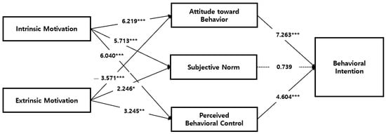 Hypothesis testing was conducted through path analysis of the structural equation model, which resulted in the rejection of one of the nine hypotheses. Among the behavioral planning theories, subjective norms (0.739) had no effect on behavioral intention; thus, the hypothesis was rejected. On the other hand, intrinsic motivation had a positive effect on attitude toward the behavior (6.219, p < 0.001), subjective norms (5.713, p < 0.001), and perceived behavioral control (6.040, p < 0.001). Extrinsic motivation had a negative effect on attitude toward the behavior (−3.571), a positive effect on the subjective norms (2.246, p < 0.05), and a positive effect on perceived behavioral control (3.245, p < 0.01). Attitude toward the behavior (7.263, p < 0.001) and perceived behavioral control (4.604, p < 0.001) had a positive effect on behavioral intention.