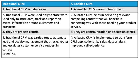 Traditional CRM vs. AI-enabled CRM (Damania 2019).