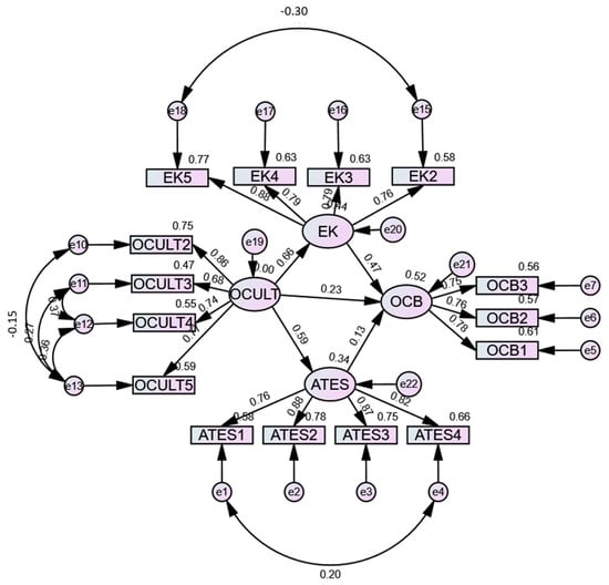 The composite reliability (CR) values for all constructs indicate high internal consistency (EK, 0.883; OCULT, 0.848; OCB, 0.807; and ATES, 0.901), ensuring the model’s reliability. Additionally, all constructs demonstrate good values for the average variance extracted, exceeding 0.5 (EK, 0.0654; OCULT, 0.585; OCB, 0.583; and ATES, 0.695). The Maximum Share Variance (EK, 0.456; OCULT, 0.442; OCB, 0.456; and ATES, 0.351) and maximum reliability (EK, 0.892; OCULT, 0.864; OCB, 0.808; and ATES, 0.908) further confirm the high level of reliability of the constructs, providing a strong foundation for the model’s validity. In order to improve reliability, the following variables were eliminated: EK1, OCULT1, and OCB4.