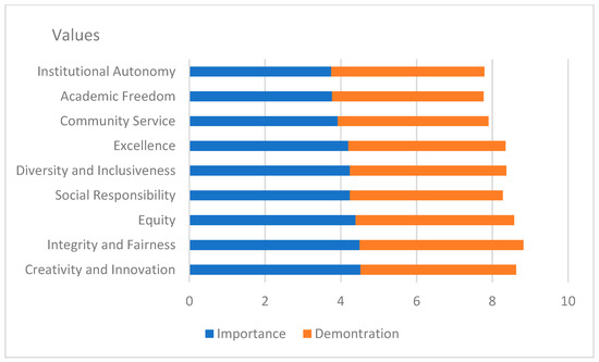 According to the MCU framework, the most important values that universities should adhere to are academic freedom, institutional autonomy, social responsibility, integrity, fairness, equity, creativity, innovation, excellence, community service, diversity, and inclusiveness (Observatory Magna Charta Universitatum 2023). Studies show that students recognize the significance of corporate social responsibility in an academic context, as evidenced by their level of engagement in activities related to this concept (Burcea and Marinescu 2011). This means that the higher education sector and the corporate world share common ground when it comes to social responsibility, and instilling this value in students during their university experience could be a powerful catalyst to address the new realities of the environment and society. Among many other benefits, social responsibility has been proven to enhance workplace safety and make meaningful contributions to a company’s long-term growth (Koo and Ki 2020). Similarly, community service has proven to be advantageous to students, fostering their professional, personal, and academic development (Donnison and Itter 2010). Students who are more aware of integrity see this value as an important element of both academic and graduate life (Anohina-Naumeca et al. 2020).
