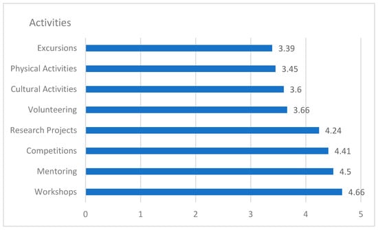 Physical activities and excursions had lower mean scores than other activities. While these activities undoubtedly contribute to personal well-being and teamwork, the lower scores suggest that employers prioritize activities that are more closely aligned with the specific competencies and experiences required in the professional world.