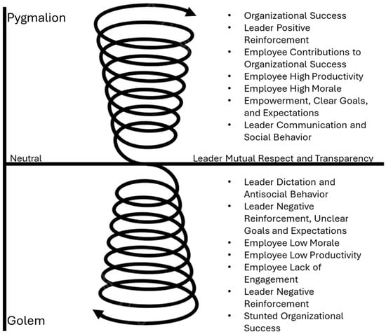 The upward (Pygmalion) and downward (Golem) spiral of positive and negative leadership behaviors, respectively, where a single loop corresponds to the feedback systems illustrated in Figure 1, and subsequent loops build on the cumulative impacts of the previous.