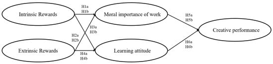 This section presents the literature on all the variables. The hypothesized research model is depicted in Figure 1. Intrinsic rewards and extrinsic rewards are the two independent variables and creative performance is the dependent variable. Moral importance of work and learning attitude are the two mediating variables. Through this hypothesized model, the present study examines the mediating effects of the moral importance of work and learning attitude between the relationship of intrinsic rewards, extrinsic rewards and creative performance of students in higher education.