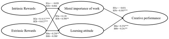 Table 2 provides the variables’ descriptive statistics, zero-order Pearson correlations, and scale reliabilities. Since several of our constructs were conceptually related, we conducted additional analyses to establish the discriminant validity of our measures. The analysis shows that intrinsic reward is positively and significantly related to learning attitude (r = 0.587, p < 0.01) and the moral importance of work (r = 0.141, p < 0.05). Correlation analysis also shows that extrinsic reward is positively and significantly related to learning attitude (r = 0.514, p < 0.01) and the moral importance of work (r = 0.187, p < 0.01). Learning attitude is positively and significantly related to job performance (r = 0.327, p < 0.01) and creative performance (r = 0.409, p < 0.01). The moral importance of work is positively and significantly related to job performance (r = 0.172, p < 0.01) and creative performance (r = 0.241, p < 0.01).