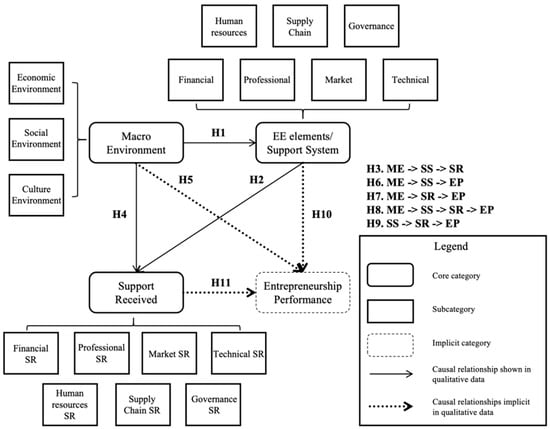 The final step is selective coding, which entails analyzing the connections between the core categories and constructing a coherent narrative to describe behavioral phenomena and contextual conditions. This process ultimately results in the development of a new substantive theoretical framework, which is called the Entrepreneurship Ecosystem, Support Received by entrepreneurs and Entrepreneurship Performance model (the ESP model). Figure 1 illustrates the constructs within the ESP model, the relationships among them, and the potential hypotheses for further quantitative testing.