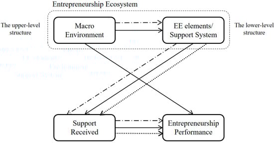 It can be inferred that the stability of the Macro Environment is a prerequisite for the EE elements to support the entrepreneurial process, and the extent of the Macro Environment determines the level of EE elements. Therefore, Macro Environment factors are defined as the upper-level structure of the EE, representing the inherent characteristics of the EE formed by historical, geographical, and other factors. In contrast, EE elements are regarded as the lower-level structure of the EE, representing the specific manifestations of regional EE’s support for the entrepreneurial process in various aspects, which is the Support System from the entrepreneurs’ perspective. In this context, the upper-level Macro Environment factors directly impact the entrepreneurial process and influence the extent of the lower-level Support System. Therefore, the following hypothesis is proposed: