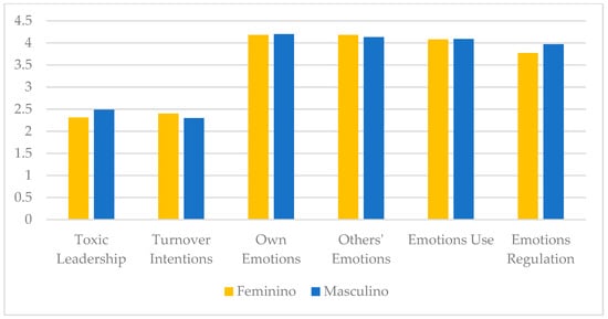 The gender of the participants did not result in statistically significant differences in the studied variables. However, male participants perceive their leader as more toxic than female participants (Figure 2). Male participants were also found to regulate their emotions better (Figure 2). On the other hand, female participants are more likely to leave the organization (Figure 2).