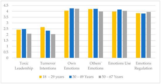 The age of the participants only resulted in significant differences in turnover intentions (F (2, 199) = 3.29, p = 0.039), with participants aged between 18 and 29 showing significantly higher turnover intentions than those between 50 and 67 (Figure 3). Participants aged between 30 and 49 perceive their leader as more toxic and have higher levels of emotional intelligence in all dimensions, except emotion regulation (Figure 3). Participants aged between 50 and 67 showed the highest levels of emotion regulation (Figure 3).