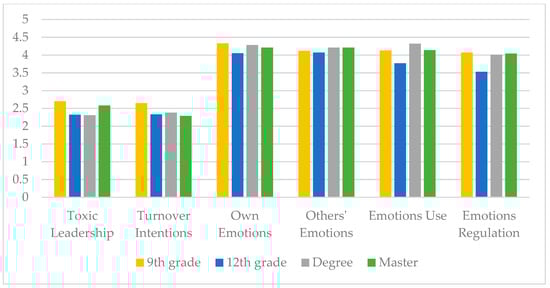 The participant’s level of education only had a significant association with emotion use (F (3, 198) = 7.15, p < 0.001) and emotion regulation (F (3, 198) = 7.48, p < 0.001). Participants with a bachelor’s degree showed significantly higher levels of emotion use than participants with a 12th grade degree (Figure 4), and participants with a 12th grade degree showed significantly lower levels of emotion regulation than participants with a bachelor’s or master’s degree (Figure 4). Although the differences are not statistically significant, participants with a 12th grade degree are more likely to perceive their leader as toxic than the other participants, and they have greater turnover intentions (Figure 4).