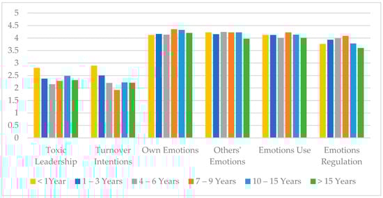 The results show that seniority in the organization is not significantly associated with any of the studied variables. However, employees who have been with the organization for a shorter period of time are more likely to perceive their leader as toxic and have the highest turnover intentions (Figure 5). On the other hand, participants who have been with the organization for 7 to 9 years have the lowest turnover intentions but the highest levels of self-emotion, use of emotions, and emotion regulation (Figure 5).