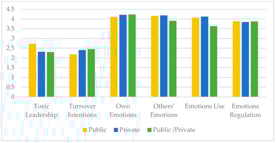 It was found that the sector of work is not significantly associated with the studied variables. However, employees working in the public sector are most likely to perceive their leader as toxic but have the lowest turnover intentions (Figure 6). Employees working in the private–public sector have higher levels of self-emotion but a poorer appraisal of others’ emotions and lower levels of emotion use (Figure 6).